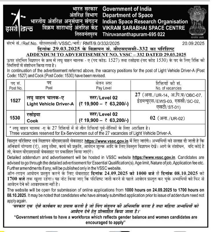 Indian Space Research Organization (ISRO), The notification for the recruitment of Assistant, Driver, Fireman & Cook has been released on the official website. This recruitment is for 39 positions. The ISRO VSSC application form has started on 24 September 2025 (Re-Open), and candidates can apply until 08 October 2025. Candidates must check the complete details for the ISRO VSSC Assistant, Driver, Fireman & Cook Recruitment 2025. provided below.