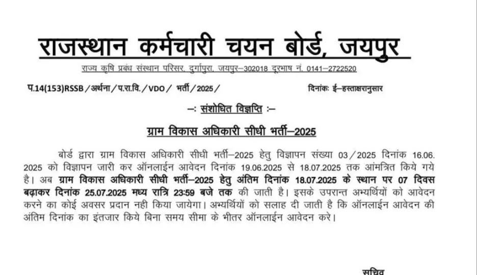 Rajasthan Staff Selection Board (RSSB), has released the Exam Date on its official website for the Village Development Officer VDO. The exam will be conducted on 02 November 2025, and the last date to submit the application form was 25 July 2025. Candidates can check their Exam Date / Admit Card Soon using their Enrollment Number, Registration Number, or Date of Birth by logging into the portal. The direct link is provided below. (Advt No. : 03/2025)
