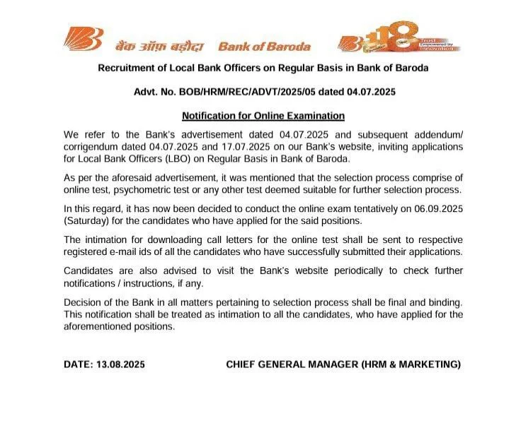 Bank of Baroda (BOB), has released the Admit Card on its official website for the Recruitment of Examination of Local Bank Officer (LBO) 2025. The exam will be conducted on 06 September 2025, and the last date to submit the application form was 03 August 2025. Candidates can check their Admit Card using their Enrollment Number, Registration Number, or Date of Birth by logging into the portal. The direct link is provided below.