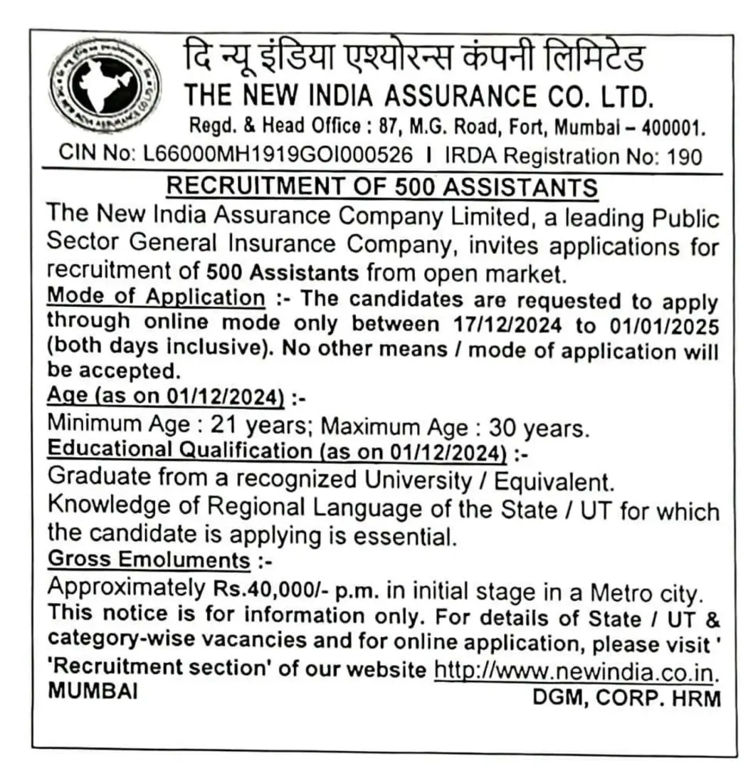 New India Assurance Company Limited (NIACL), has released Final Result on official website for the recruitment of Assistants Post. This recruitment is for 500 positions. The NIACL Exam was Conducted in 02 March 2025. The last date to submit the application form was 01th January 2025. and can be checked through Enrollment number / Registration number / Date of birth by login into the portal. Which has given below.